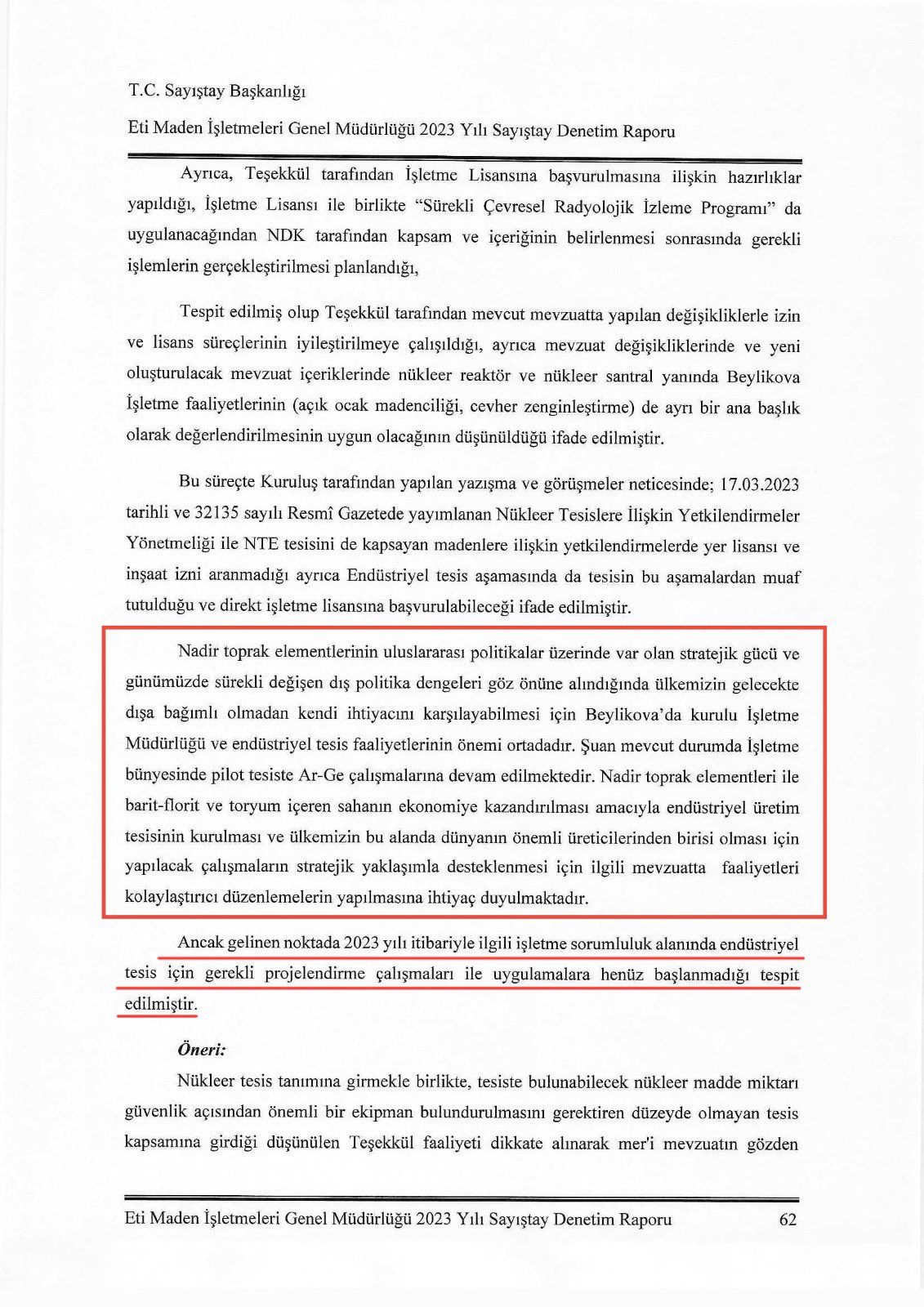 Yavuzyılmaz, “Eti Maden İşletmeleri Sayıştay Denetim Raporuna göre AKP’nin, Eskişehir Beylikova’daki Nadir Toprak Elementlerinin dışa bağımlı olunmadan üretilmesini sağlayacak endüstriyel tesisleri kurma sürecini savsakladığını tespit ettik” ifadelerini kullandı.