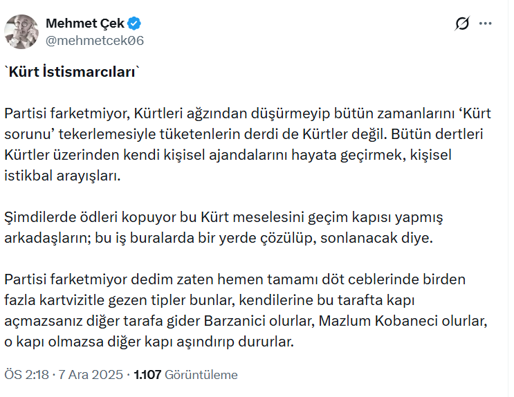Gazeteci Mehmet Çek, X hesabından yaptığı paylaşımda Türkiye’de “Kürt sorunu” üzerinden siyaset yapan aktörlere yönelik dikkat çekici eleştirilerde bulundu. İsim vermeden Orhan Miroğlu’nun paylaşımını eleştiren Çek, bu çevrelerin Kürtleri temsil etmekten çok kişisel çıkar peşinde olduğunu savundu.